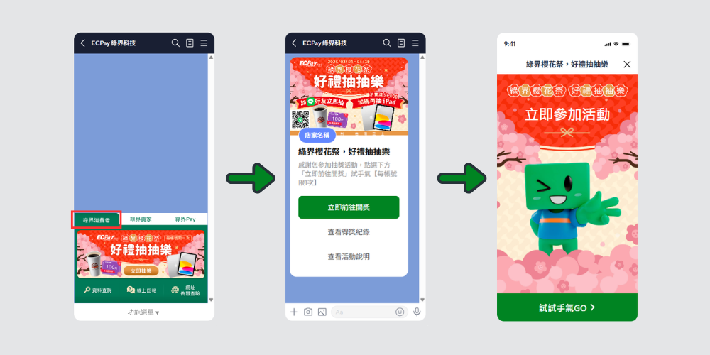 綠界櫻花祭,好禮抽抽樂 【活動日期】2026/03/01 (日) 至 2026/04/30 (四) 【活動內容及獎項】 🔶 LINE好友立即抽 成為綠界好友 🙆 參加資格: 凡加入綠界官方 LINE 好友@ecpay,即可參加抽獎 ✨抽獎贈品: 每月抽出 7-ELEVEN 100元現金抵用劵 / 100名 ; 7-ELEVEN美式咖啡(中) / 200名 ※ 兌換效期至2026/05/31止,如有逾期兌換或遺失序號,恕不補發 🗳️抽獎步驟: